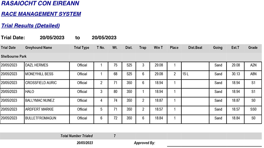 SHELBOURNE PARK TRIAL RESULTS, SATURDAY 20/5/2023