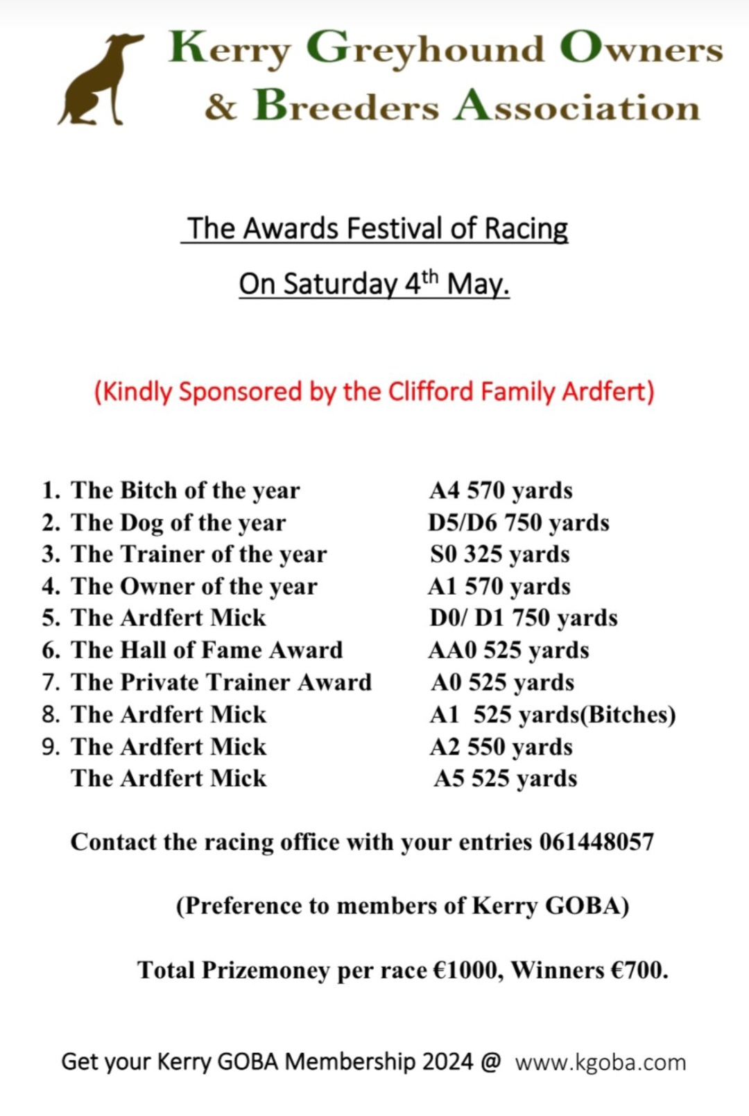 The Kerry Greyhound Owners & Breeders Association Awards Festival of Racing takes place this Saturday night at Kingdom Greyhound Stadium in Tralee. Kindly sponsored by the Clifford Family, Adrfert.