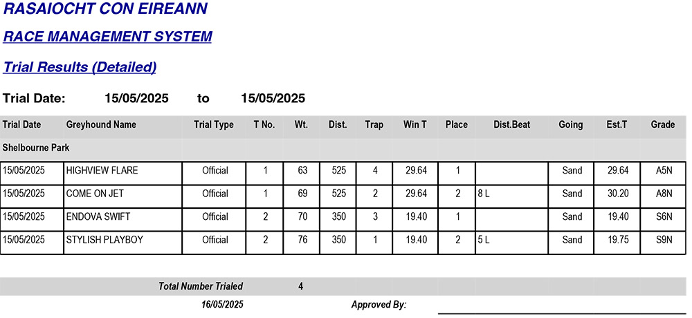 SHELBOURNE PARK TRIAL RESULTS THURSDAY 15/05/2025