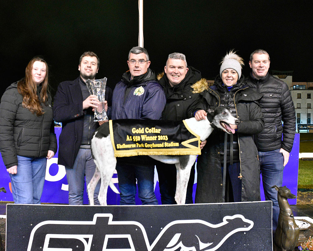 Mark Maguire presents the trophy to Damien Matthews after Fernandes won the final of the 2023 Gold Collar 550 at Shelbourne Park. Also included are Plunkett Matthews, Lisa Finnigan and Gervase and Katie Auder. Pic: Imelda Grauer
