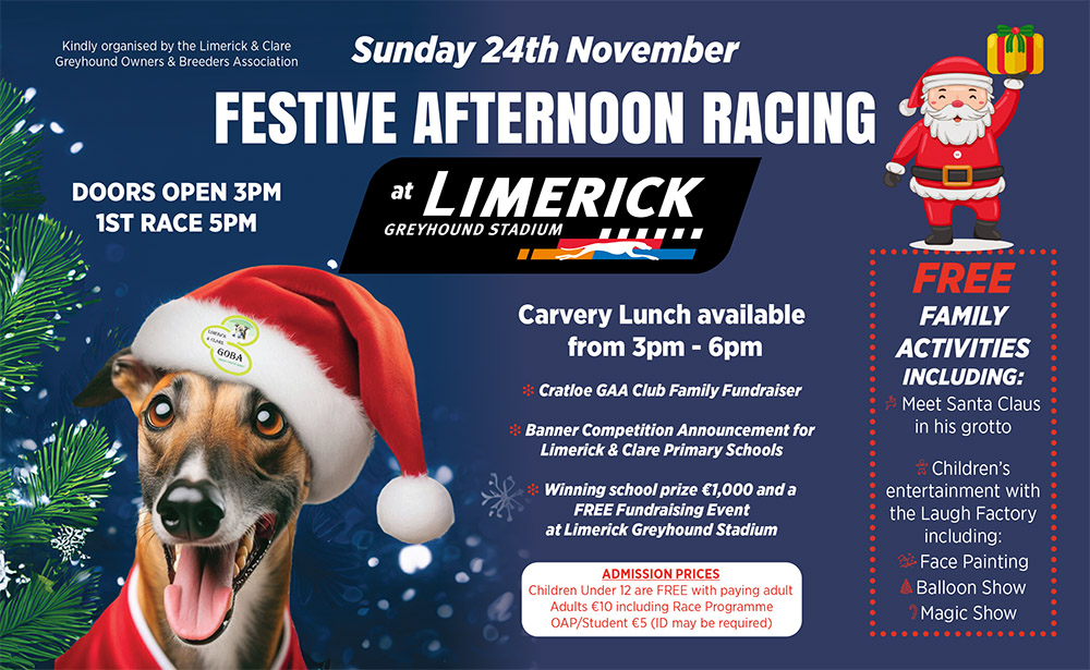 Mark your calendars for November 24th and join them for an afternoon of thrilling races and festive fun. More details available on www.limerickgreyhoundstadium.ie