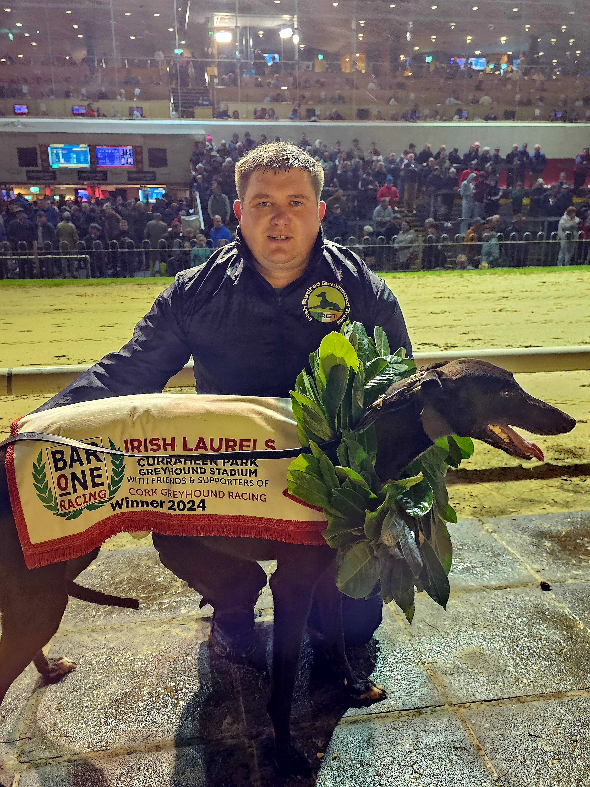 Photo shows: Pat Norris Junior with Crafty Shivoo after claiming victory at the Bar One Irish Greyhound Laurels 2024 hosted in Curraheen Park Greyhound Stadium.