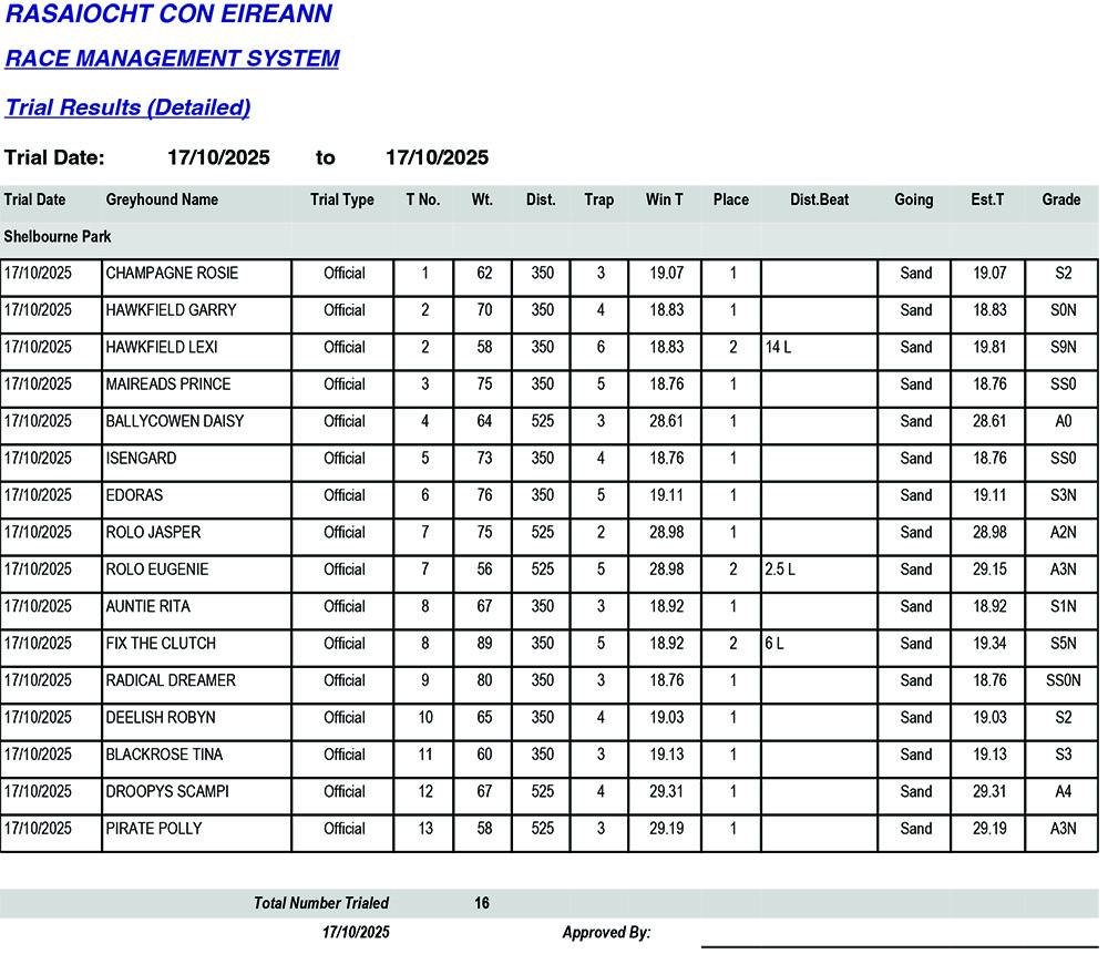 SHELBOURNE PARK TRIAL RESULTS FRIDAY 17/10/2025