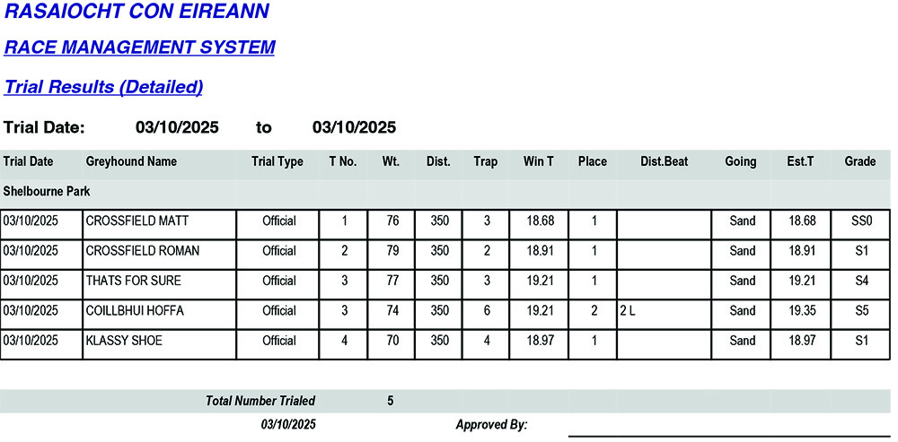 Shelbourne Park Trial Results Friday 3/10/2025: