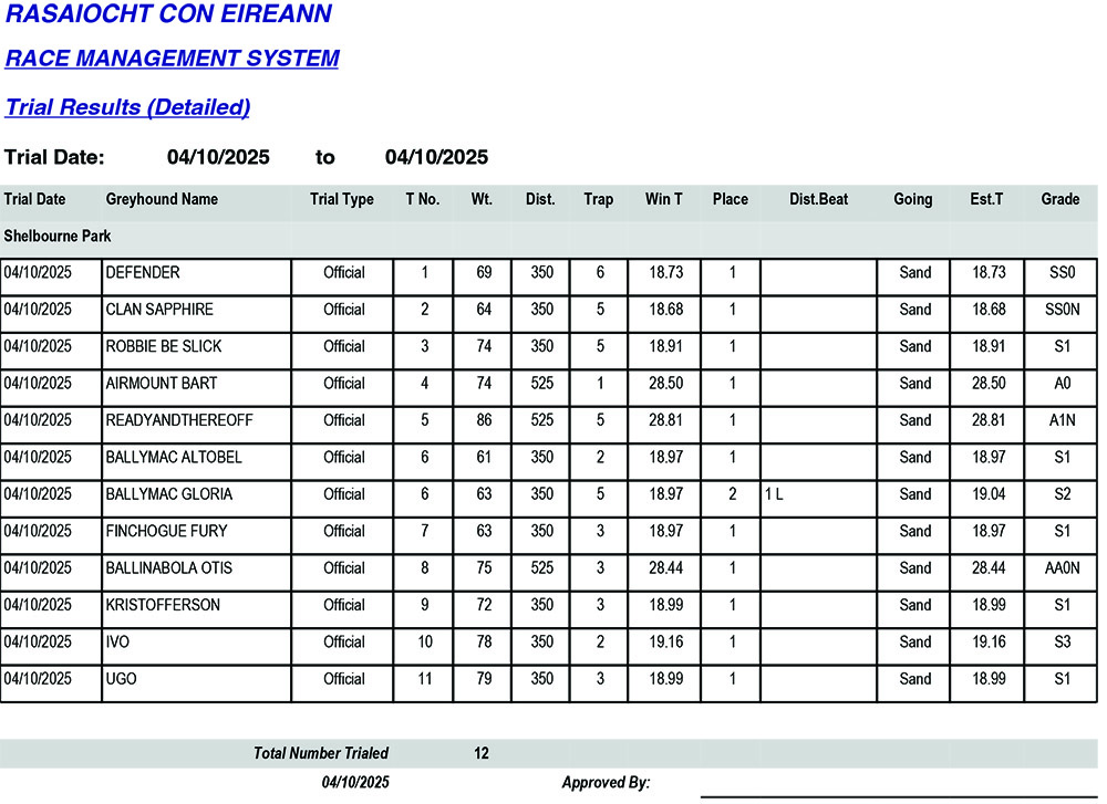Shelbourne Park Trial Results Saturday 4/10/2025: