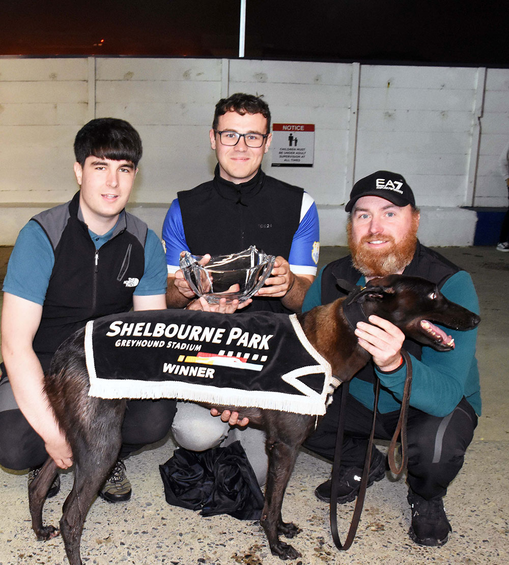 Representing the Robert Gleeson/ Paul Allen combination, the son of Malachi and Droopys Charm broke on terms and held a narrow lead into the turn before swinging wide. Despite this, he held on to his advantage and once straightening up, started to put daylight between himself and his nearest pursuer, the reserve, Coolavanny Bruno. (Pic right: Conor Matthews Racing Support Officer Shelbourne Park presents the trophy to Lorcan O'Reilly after Droopys Deploy won Talking Dogs On Monday ON1 525 Final. Also included is trainer Robert Gleeson.)  Pic: Imelda Grauer