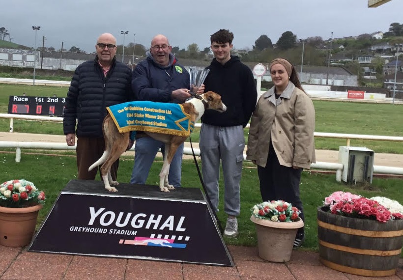 Gearoid Gubbins making the presentation to Nicky Walsh after Its Paddys Wish won the final of the Ger Gubbins Construction A3/A4 stake at Youghal on Saturday. Also included is JJ Fennelly and Caoimhe Gubbins (Youghal Greyhound Racing Team)
