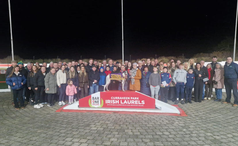 Droopys Pablo for the All Angles Syndicate & trainer John Linehan winner of The Danny Corkery Memorial A3/A4 Final. The Corkery family pictured with friends making the winning presentation.