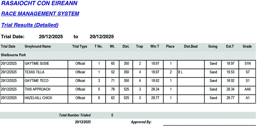 SHELBOURNE PARK TRIAL RESULTS SATURDAY 20/12/2025