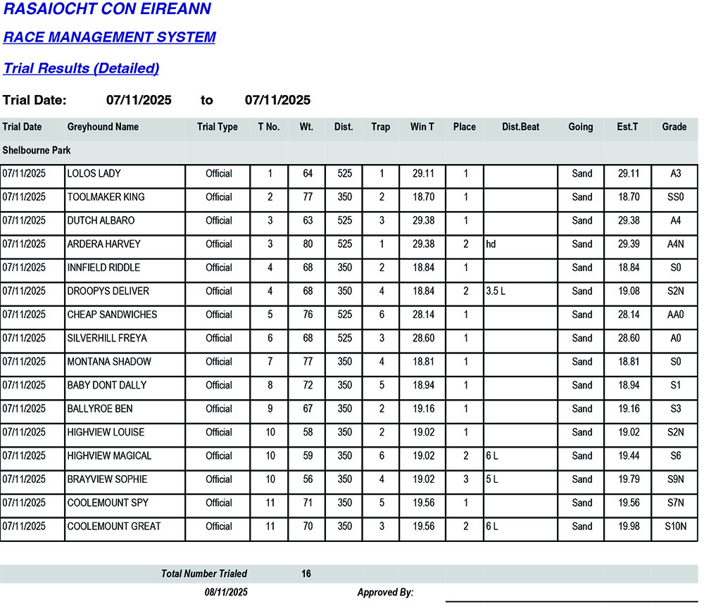 Shelbourne Park Trial Results Friday 7/11/2025: