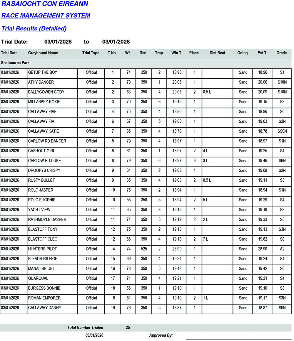 Shelbourne Park Trial Results Saturday 3/1/2026: