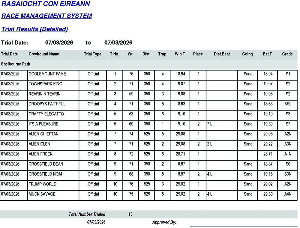 Shelbourne Park Trial Results Saturday 7/3/2026: