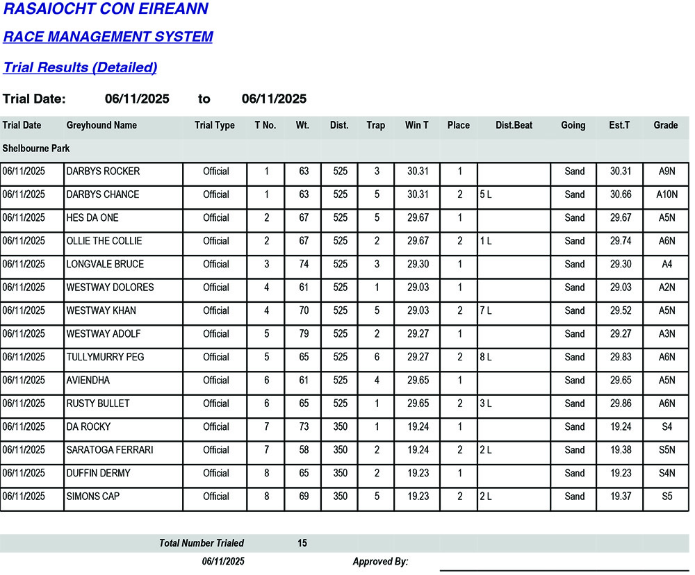 Shelbourne Park Trial Results Thursday 6/11/2025: