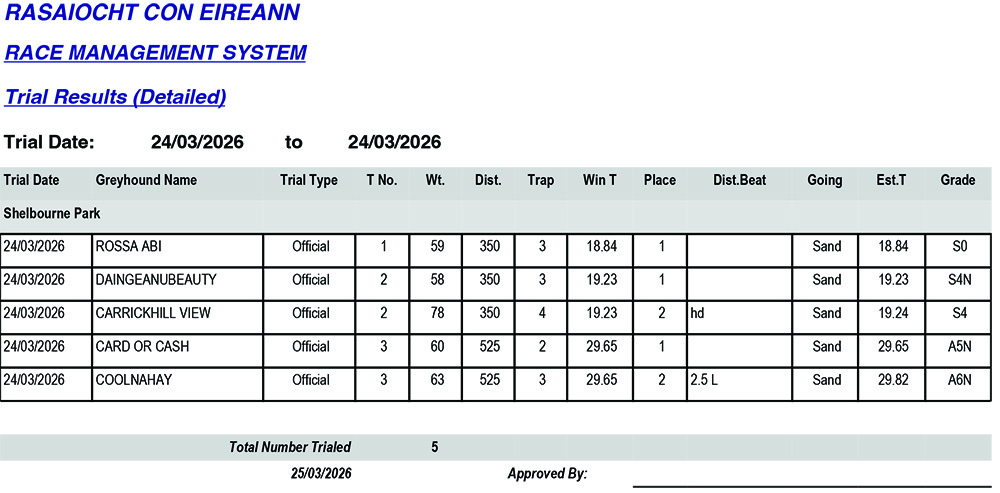 Shelbourne Park Trial Results Tuesday 24/3/2026: