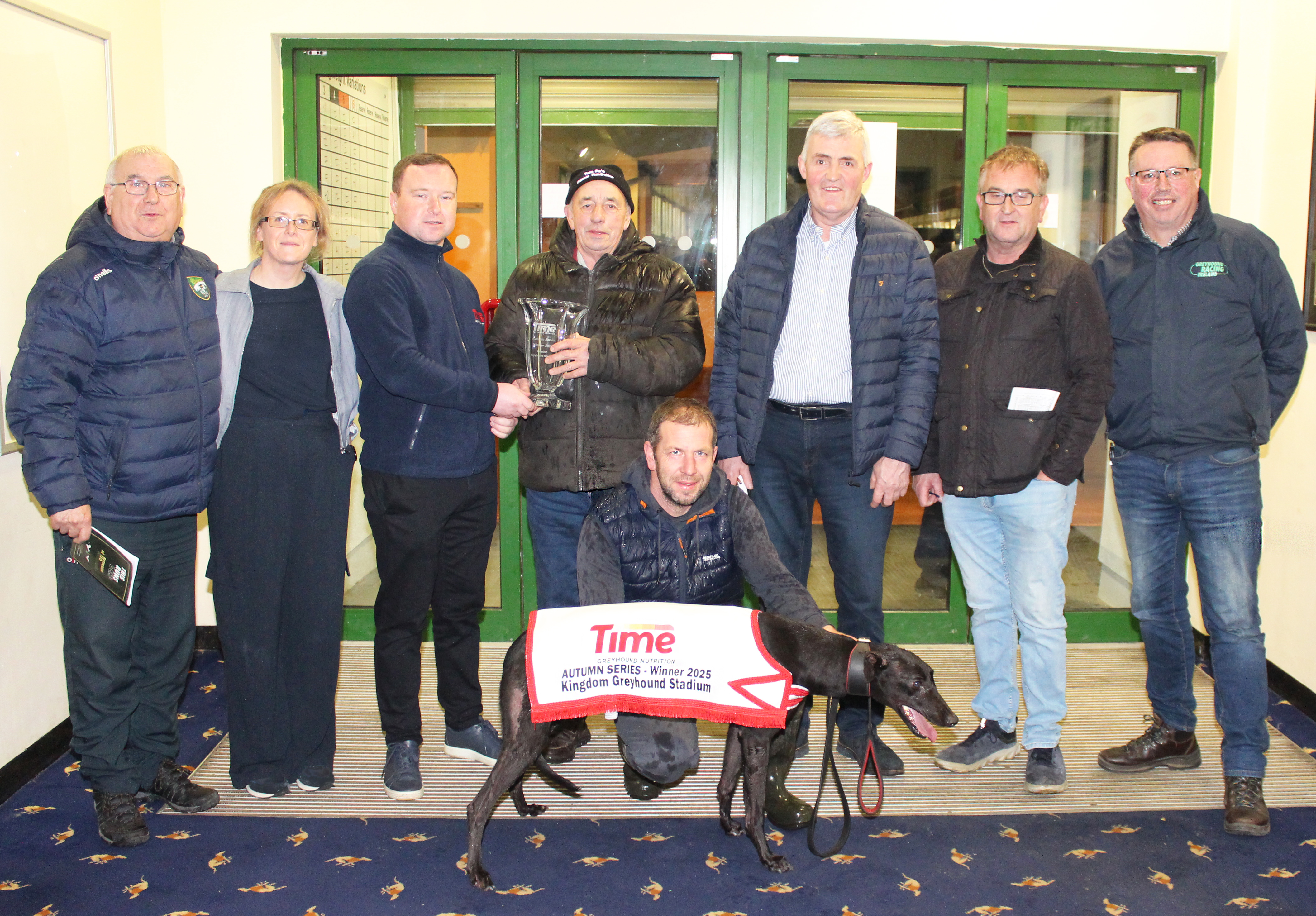Pictured: Sponsor Shane Rigney of Time making the winning presentation to Tom Pa O'Connor following Saleen Shannon's win in the Final of the TIME Greyhound Nutrition A3 Bitch Stake in Tralee on Friday night with Joe Langan, Heather Hartley KGS, Patsy Skeehan, Eoin Brassil, Kieran Casey RM KGS & Patrick O'Connor.